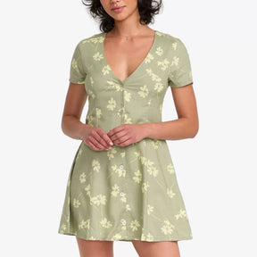 RVCA mini dress with a V-neck and button-front closure. Light green with an all-over floral print on the front.